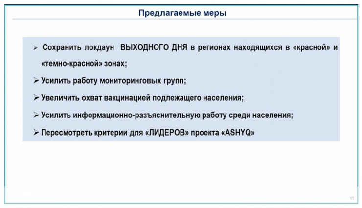 "В целях обеспечения дальнейшей стабилизации эпидемиологический ситуации в республике и недопущения роста заболеваемости и летальности от КВИ предлагается сохранить локдаун выходного дня в регионах, находящихся в "красной" и "темно-красной" зонах, а также усилить работу мониторинговых групп, увеличить охват вакцинацией подлежащего населения, усилить информационно-разъяснительную работу среди населения. С учетом обращений предпринимателей доработать критерии для "лидеров проекта Ashyq", - озвучил министр здравоохранения на заседании правительства.