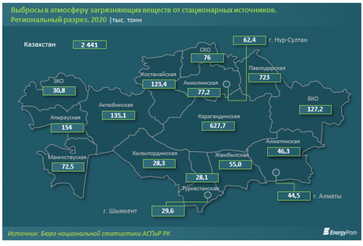 Среди регионов более половины вредных веществ, выброшенных в атмосферный воздух, совокупно приходится на Павлодарскую (723 тысячи тонн) и Карагандинскую (627,7 тысячи тонн) области.