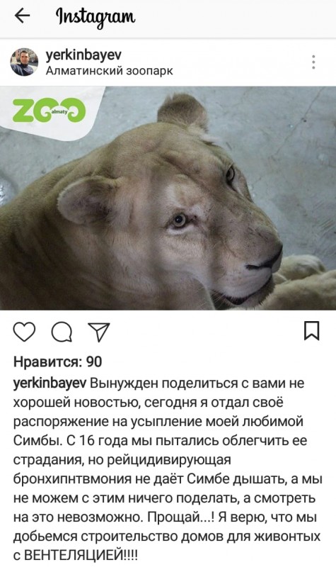 "Вынужден поделиться с вами нехорошей новостью, сегодня я отдал свое распоряжение на усыпление моей любимой Симбы. С 16-го года мы пытались облегчить ее страдания, но рецидивирующая бронхопневмония не дает Симбе дышать, а мы не можем с этим ничего поделать, а смотреть на это невозможно. Прощай...! Я верю, что мы добьемся строительства домов для животных с вентиляцией!" - написал директор Алматинского зоопарка Ержан Еркинбаев на своей странице в Instagram.