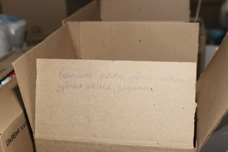 Внизу, уже на выходе из здания, сталкиваемся с запыхавшейся девушкой по имени Динара. Она привезла на такси теплую обувь и просит волонтеров выгрузить тяжелые коробки из машины.
