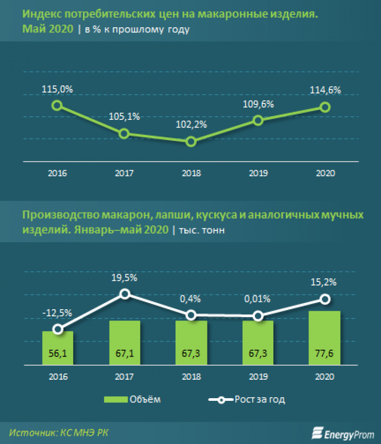 Сообщается, что объем производства макарон, лапши, кускуса и аналогичных мучных изделий за год вырос на 15,2 процента и за январь – май 2020 года и составил 77,6 тысячи тонн.