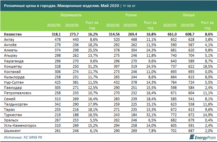 Среди крупных городов и мегаполисов самые высокие цены на вермишель и рожки зафиксированы в Актау: 478 и 520 тенге за килограмм, соответственно. Лапша дороже всего в Туркестане - 772 тенге за килограмм.
