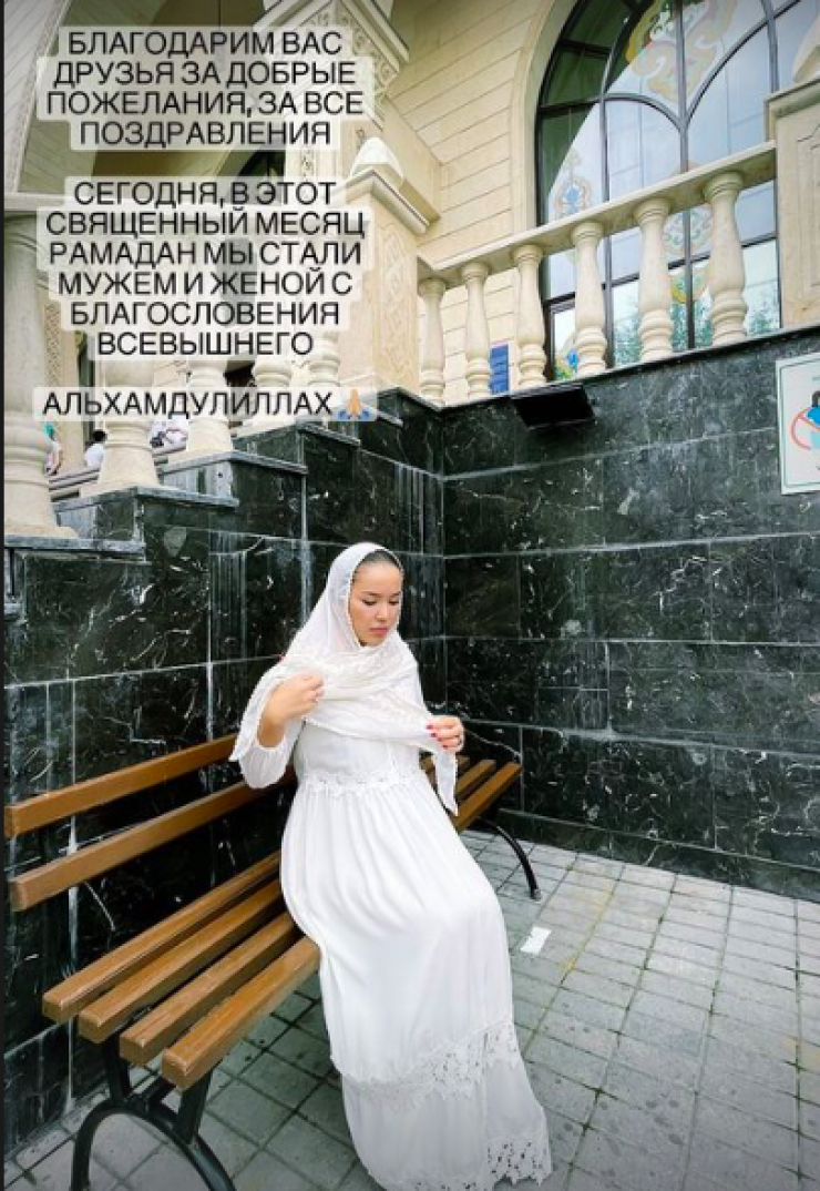 "Благодарим вас, друзья, за добрые пожелания, за все поздравления. Сегодня, в этот священный месяц Рамадан, мы стали мужем и женой с благословения всевышнего", - написала девушка в одной из публикаций.
