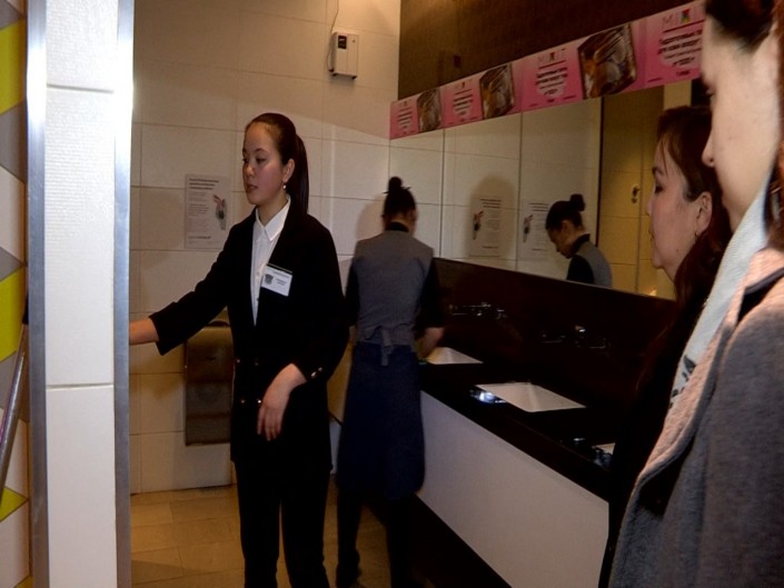 Сотрудница охраны Ботагоз Алихан показывает место, где принимала роды у посетительницы торгового центра.