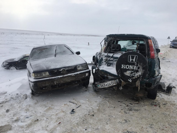 "Водитель легковой машины Mercedes на скользком участке дороги, не справившись с управлением, выехав на полосу встречного движения, допустил столкновение с машиной ВАЗ 2115. В целях безопасности нарядом патрульной полиции было перекрыто движение всех транспортных средств. В это время водитель грузовой машины Volvo, движущийся со стороны города Хромтау, не учитывая дорожно-метеорологические условия, допустил столкновение с автоколонной, состоящей из девяти машин, на обочине дороги", - говорится в сообщении Департамента полиции Актюбинской области.