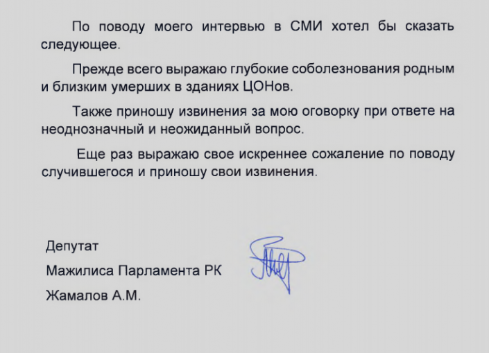 "По поводу моего интервью в СМИ хотел бы сказать следующее. Прежде всего выражаю глубокие соболезнования родным и близким умерших в зданиях ЦОНов. Также приношу извинения за мою оговорку при ответе на неоднозначный и неожиданный вопрос. Еще раз выражаю свое искреннее сожаление по поводу случившегося и приношу свои извинения".