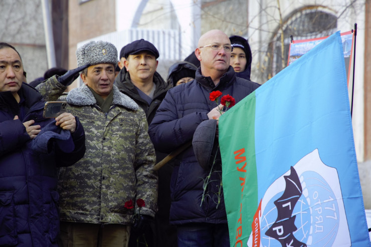 У дома также собрались ветераны войны в Афганистане, воспитанники республиканского движения "Жас сарбаз" и военно-патриотического клуба имени Кара Майора. Специально на это мероприятие приехал из Узбекистана ветеран войны в Афганистане командир первого "мусульманского батальона" полковник Хабибджан Холбаев, участник штурма дворца Амина в 1979 году.