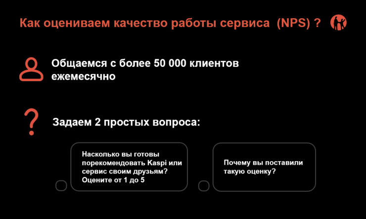 По его словам, качество продуктов в компании оценивают по индексу лояльности Net Promoter Score (NPS). Каждый месяц Kaspi.kz общается с более 50 тысячами разных клиентов и спрашивает мнение о продуктах и сервисах, которыми они пользовались. Это общение записывается, чтобы затем ответственный за продукт и продуктовые команды могли послушать мнение клиента о их сервисе и предложить дальнейшие улучшения.