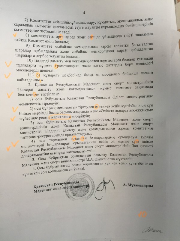 Отметим, что приказ с ошибками министра культуры и спорта РК "О внесении изменений в приказ министра культуры и спорта Республики Казахстан от 14 октября 2014 года №36 "Об утверждении Положения государственного учреждения "Комитет по развитию языков и общественно-политической работы Министерства культуры и спорта Республики Казахстан" от 18 мая 2015 года на казахском языке был официально опубликован 28 июля 2015 года. На четырех страницах документа пользователи Казнета насчитали около 50 орфографических ошибок и опечаток.