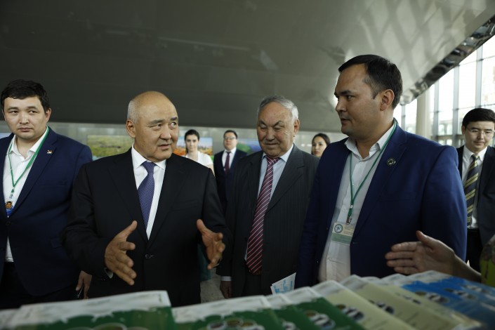 В холле киноконцертного зала расположилась сельскохозяйственная выставка. Производители из разных регионов страны представляли свою продукцию заместителю премьер-министра - министру сельского хозяйства Умирзаку Шукееву и даже предлагали ее попробовать.