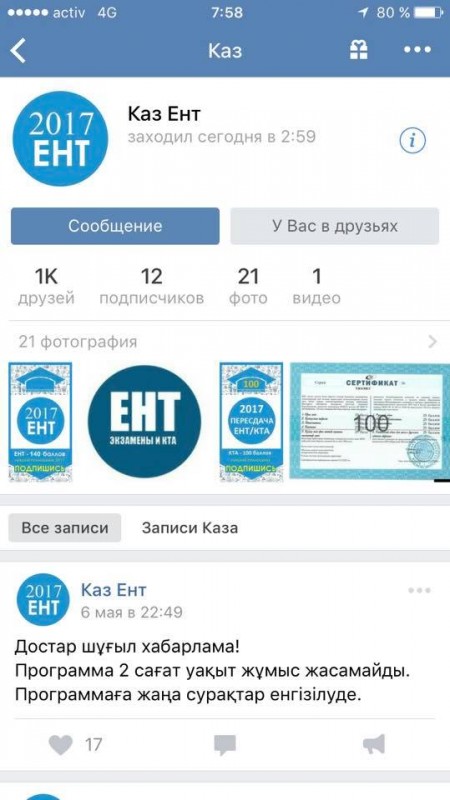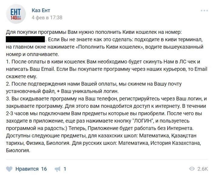 В социальных сетях начали продавать программу, которая якобы помогает набрать хорошие баллы на ЕНТ. Об этом в Facebook написал алматинец Дидар Марданов, передает корреспондент Tengrinews.kz.