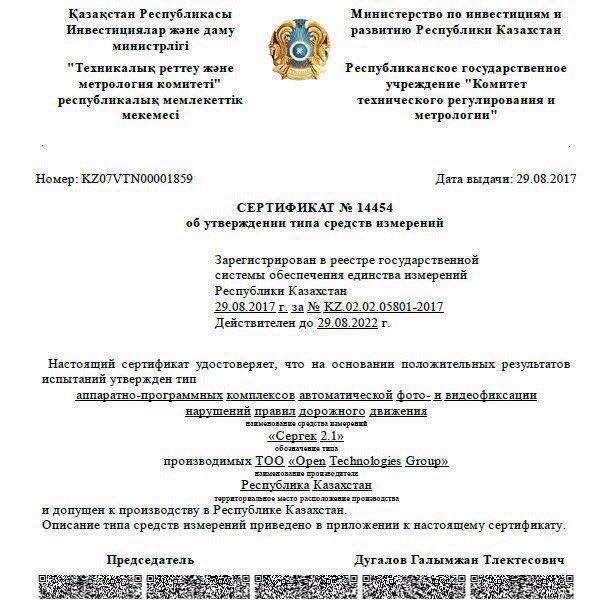 По словам Мейрама Дюсюкова, аппаратно-программный комплекс "Сергек" зарегистрирован в Комитете технического регулирования и мониторинга как прибор автоматической фото-, видеофиксации нарушения правил дорожного движения.