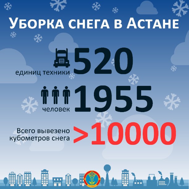 "В Астане выдалось снежное утро. Столичные коммунальщики и специальная техника работают на улицах города в две смены, круглосуточно очищая Астану от снега. На всей территории города трудятся 1955 рабочих и 520 единиц специализированной техники. Количество выделенных работников и специализированной техники варьируется в зависимости от размера автодороги. Так, на таких крупных улицах столицы, как Кенесары, Керей Жанибек хандары, Сейфуллина и проспект Республики задействовано в очистке снега наибольшее количество людей и коммунальных машин", - проинформировали в пресс-службе столичной администрации.