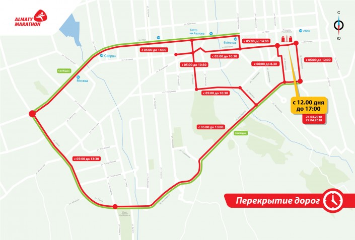 Проспект Абая от улицы Саина до улицы Байтурсынова (северная сторона будет свободна для автотранспорта), улица Сатпаева от улицы Байтурсынова до улицы Желтоксан, улица Байтурсынова от проспекта Абая до улицы Сатпаева - движение будет перекрыто с 05.00 до 14.00.