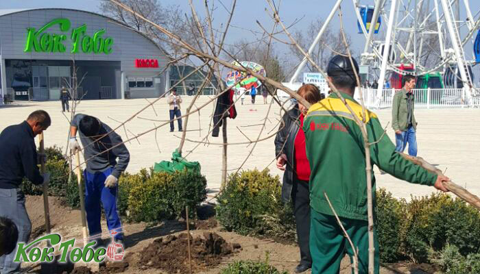 Отмечается, что бывший премьер-министр Казахстана Сергей Терещенко преподнес подарок - 200 саженцев алматинского апорта, которые были высажены в марте на южном склоне горы. Кроме того, в апреле работниками парка были посажены еще 1150 карагачей, в результате чего на северо-западном склоне горы будет целая полоса деревьев с раскидистой кроной. Тот факт, что на верхней площадке в настоящее время недостаточно зеленых насаждений, объясняется тем, что работы по благоустройству Коктобе еще не закончены. Общее количество посаженных деревьев - 3472, кустарников - 4294.
