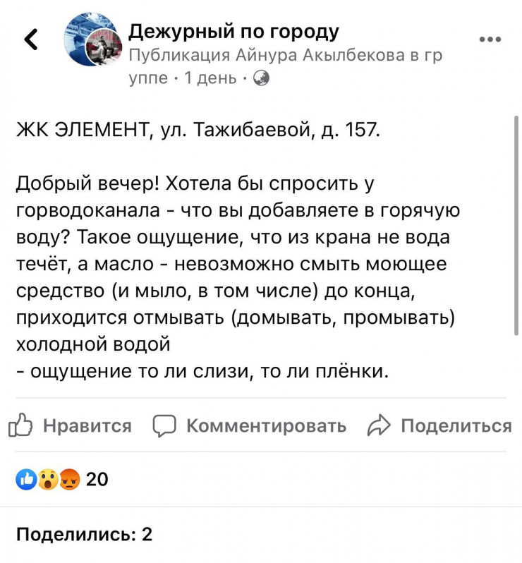 Жалоба на "маслянистую" горячую воду в ЖК появилась в группе в Facebook "Дежурный по городу".