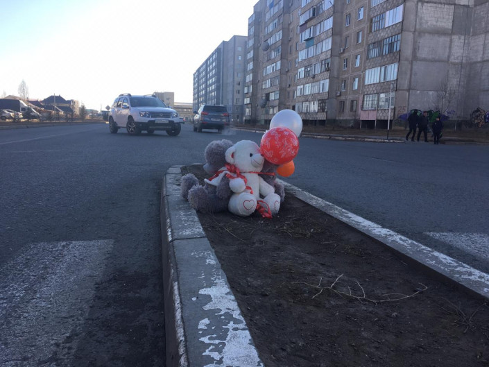 Сейчас на месте гибели школьницы Айару Ермек лежат цветы и мягкие игрушки. Их принесли жители Уральска, которые скорбят о гибели девочки.