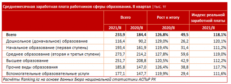 Средняя месячная зарплата работников образования во втором квартале года достигла 233,9 тысячи тенге и выросла на 26,8 процента по сравнению с аналогичным периодом прошлого года. Индекс покупательной способности зарплаты работников образования составил 18,1 процента.