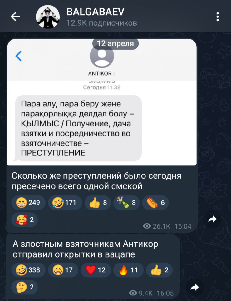 "Сколько же преступлений было сегодня пресечено всего одной эсэмэской", "А злостным взяточникам Антикор направил открытки в "Вотсапе", - написал он в Telegram.