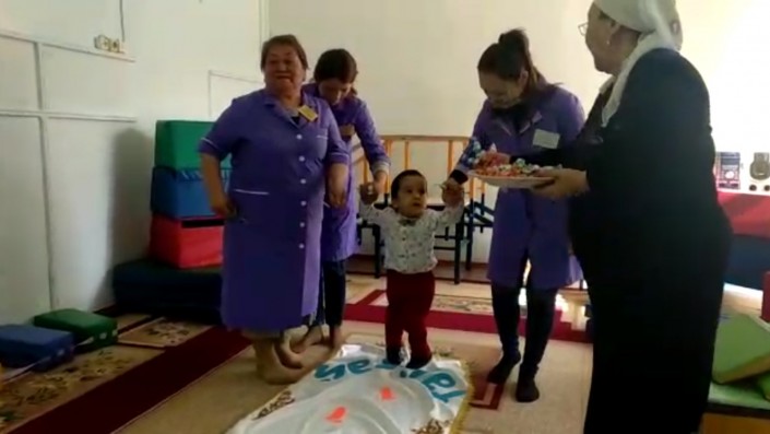 После курса лечения и реабилитации, к радости родителей и лечащих врачей, Муслим сделал свои первые самостоятельные шаги. В реабилитационном центре по казахским обычаям провели обряд "тусау кесу".