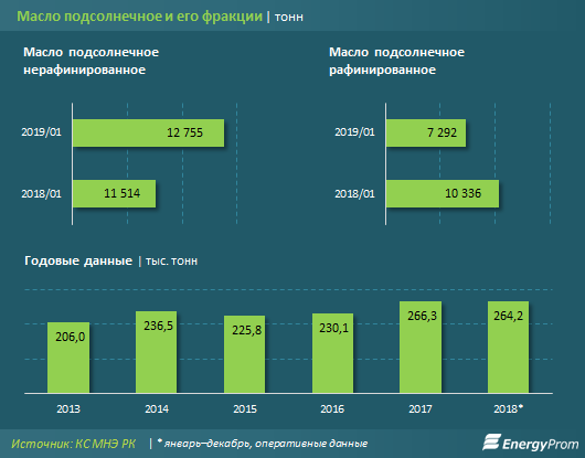 За январь 2018 года производство подсолнечного нерафинированного масла увеличилось на 10,8 процента за год, до 12,8 тысячи тонн. Производство рафинированного масла, напротив, сократилось на 29,5 процента, до 7,3 тысячи тонн.