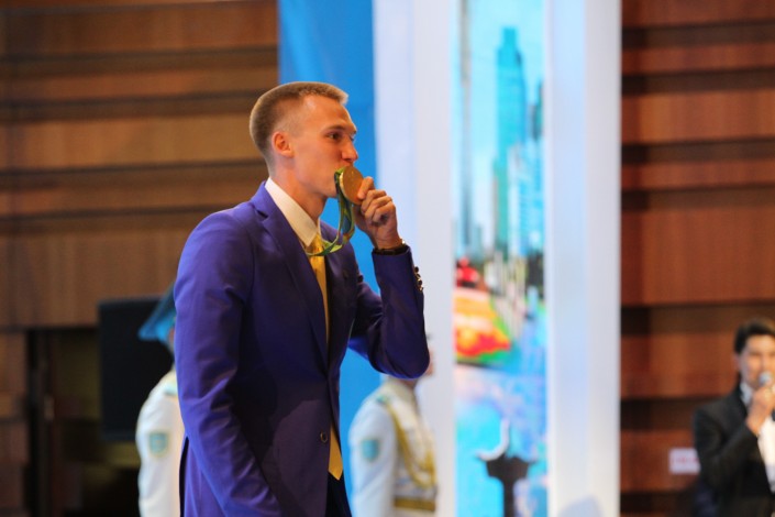 Церемония чествования олимпийских чемпионов и призеров Игр проходит в ЦКЗ "Казахстан". Назарбаев поздравил спортсменов с успешным выступлением, а также отметил, что это подарок к 25-летию независимости Казахстана.