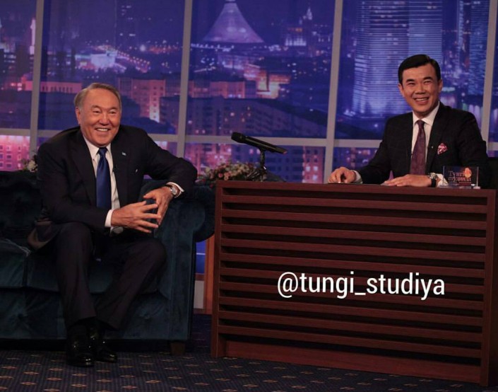 Назарбаев пришел в гости к Нурлану Коянбаеву на "Түнгі студияда", передает корреспондент Tengrinews.kz.