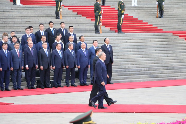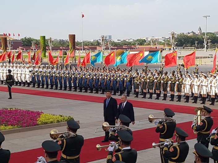 На площади Тяньаньмэнь звучали гимны стран, которые сопровождались грохотом пушек. Гимн Казахстана зазвучал первым.