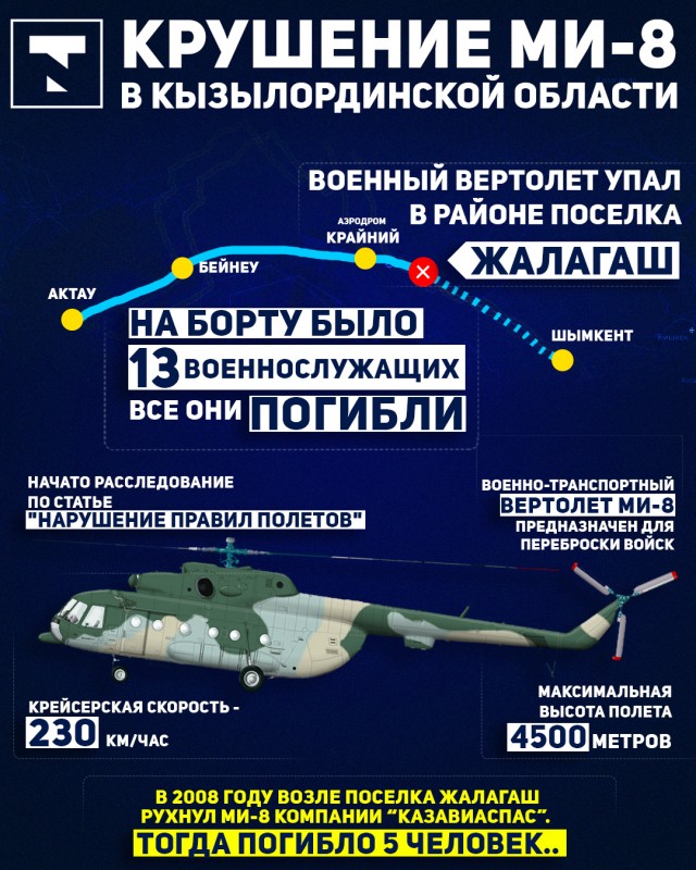 Вертолет Ми-8 потерпел крушение в Жалагашском районе Кызылординской области. Погибли 13 военнослужащих.