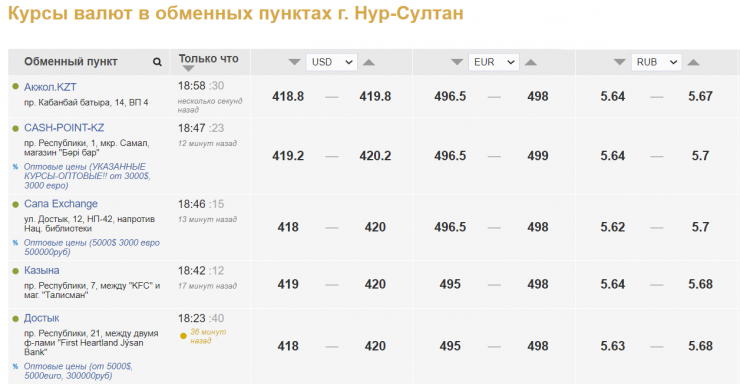 По данным kurs.kz, в настоящее время в обменных пунктах Нур-Султана доллар продают за 419,8-420,2 тенге, покупают - за 418-419,2 тенге, в Алматы обменники продают доллар по 419,8-420,5 тенге, покупают - за 418-419 тенге.