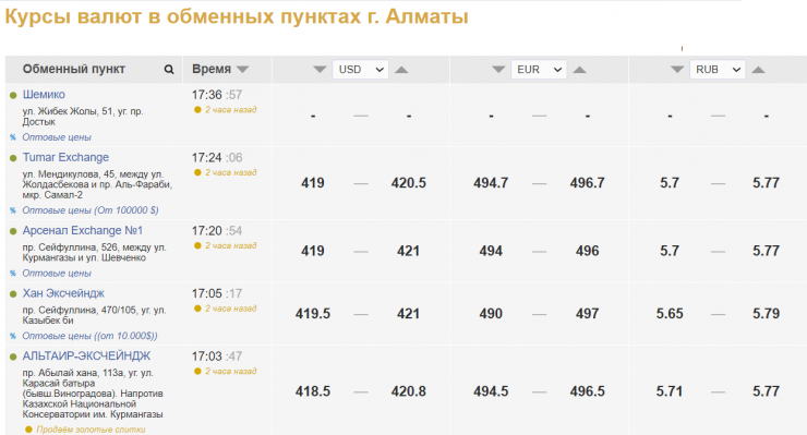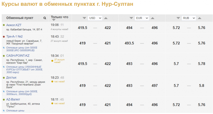 В обменных пунктах Нур-Султана доллар продают за 421-422 тенге, покупают за 419-419,5 тенге. В обменных пунктах Алматы продажа сложилась на уровне 420,5-421 тенге, покупка - 418,5-419,5 тенге.