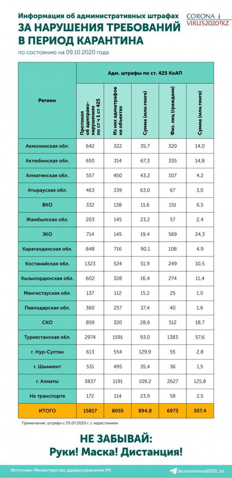 Статистику об административных штрафах за нарушение санитарно-эпидемиологических требований, выписанных с 5 июля 2020 года, опубликовали в Telegram-канале Coronavirus2020, передает Tengrinews.kz