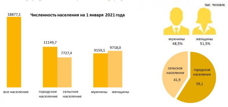"Численность населения страны на 1 января 2021 года составила 18 миллионов 877 тысяч человек, в том числе городского - 11 миллионов 149 тысяч человек (59,1 процента), сельского - 7 миллионов 727 тысяч человек (40,9 процента)", - говорится в сообщении.