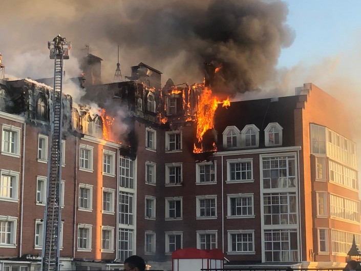 Накануне вечером начался пожар в элитном ЖК "Британский квартал" в Нур-Султане. К моменту прибытия пожарных в 19:46 горела кровля жилого дома.