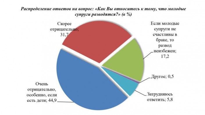 Большинство опрошенных не готовы разводиться в случае возникновения каких-либо трудностей (62,2 процента), в том числе более трети опрошенных ответили однозначно "нет, так как семейные трудности не могут напугать и стать причиной развода".