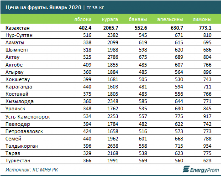 Также заметно подорожали фрукты: за год бананы - на 14,8 процента, апельсины - на 11,2 процента, яблоки - на 7,6 процента. Лимоны, напротив, стоят немного дешевле, чем годом ранее, - на процент. Самые дорогие яблоки и апельсины продаются в Усть-Каменогорске, курага и бананы - в Актау, а лимоны - в Талдыкоргане.
