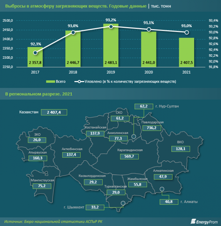 За 2021 год общий объем выбросов от всех стационарных источников загрязнения в Казахстане составил 34,3 миллиона тонн, что на 3,3 процента меньше, чем в 2020 году. Уловлено и обезврежено 31,9 миллиона тонн выбросов. Объем выбросов загрязняющих веществ в атмосферный воздух в 2021 году составил 2,4 миллиона тонн, на 1,4 процента меньше по сравнению с 2020 годом.