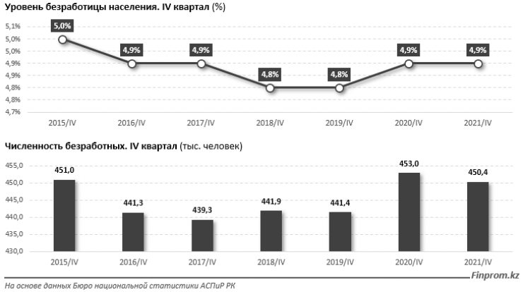 Уровень безработицы в Казахстане второй год остается без изменений. В конце 2021 года он составил 4,9 процента, передает корреспондент Tengrinews.kz со ссылкой на Finprom.kz.
