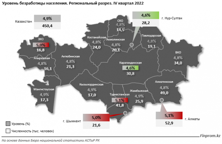 Среди регионов по уровню безработицы лидируют Туркестанская область и Алматы - 5,1 процента. За ними идут Шымкент и Западно-Казахстанская область - 5 процентов.