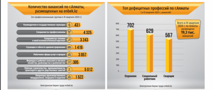 "В целом за этот период на Электронной бирже труда www.enbek.kz в части квалифицированного труда по Алматы было размещено 19,3 тысячи вакансий, в том числе пять тысяч вакансий для рабочих промышленности, строительства, транспорта и других родственных занятий, 4,3 тысячи вакансий для специалистов-профессионалов, более трех тысяч вакансий для служащих в области администрирования", - говорится в сообщении.