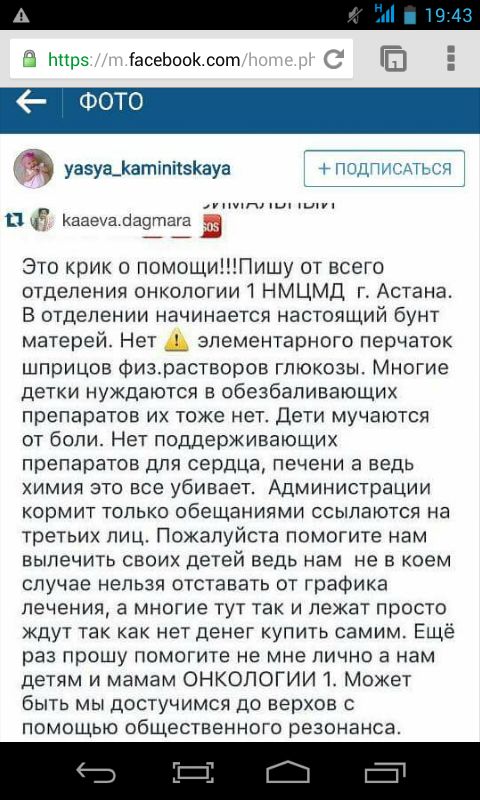 В социальных сетях распространялось сообщение матерей, дети которых находятся в отделении онкологии ННЦМД. "Это крик о помощи! Пишу от всего отделения онкологии ННЦМД Астаны. В отделении начинается самый настоящий бунт матерей. Нет элементарного: перчаток, шприцов, физрастворов, глюкозы. Многие детки нуждаются в обезболивающих препаратах, их тоже нет. Дети мучаются от боли. Нет поддерживающих препаратов для сердца, печени, а ведь химия все это убивает", - говорится в распространенном сообщении в Instagram.