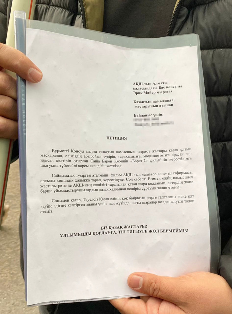 "Мы, патриотичная казахская молодежь, активно призываем не выпускать в свет продолжение фильма "Борат". Его следует бойкотировать. Мы требуем от актера и всех создателей фильма извиниться перед казахским народом", - сказали алматинцы.