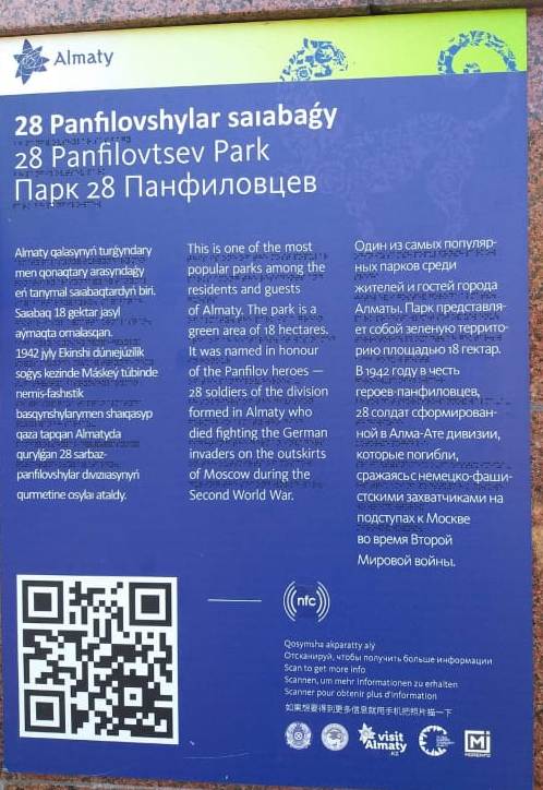 "В целях повышения информированности туристов о городе Алматы в марте текущего года за счет спонсорских средств установлена информационная табличка с QR-кодом на территории парка имени 28 гвардейцев-панфиловцев. На данной табличке размещена краткая информация о создании и истории парка. Информируем, что в скором времени все ошибки в тексте будут исправлены", - сообщили в управлении.