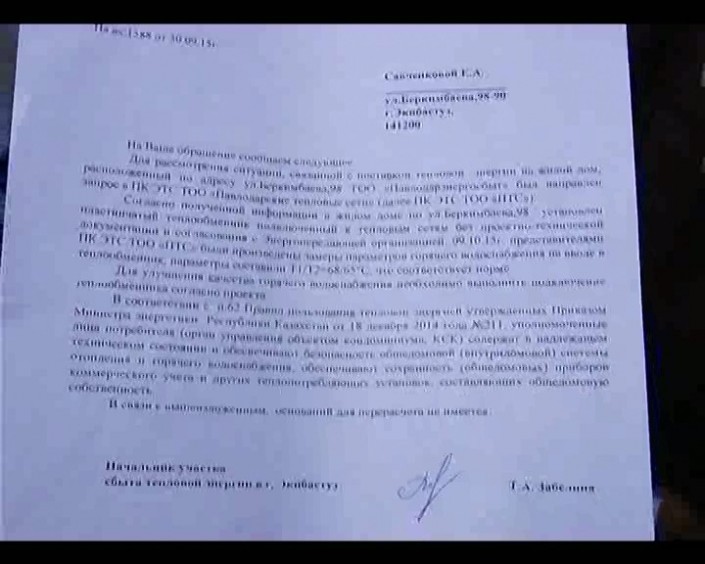 С октября 2015 года инициативная группа жильцов обращалась к местному КСП "Саял-1", представителям тепловых сетей, заместителю акима по оперативно-хозяйственным вопросам, к руководителю городской администрации с жалобами. После многочисленных жалоб в доме по указанному адресу специально созданной комиссией несколько раз производились замеры показателей горячей воды. Всего с октября 2015 года до настоящего времени, по словам местных жителей, было проведено 9 проверок. На входе и выходе из дома параметры вполне соответствуют норме, а вот в квартирах изначально температура горячей воды едва достигала 30 градусов, вместо положенных 55.
