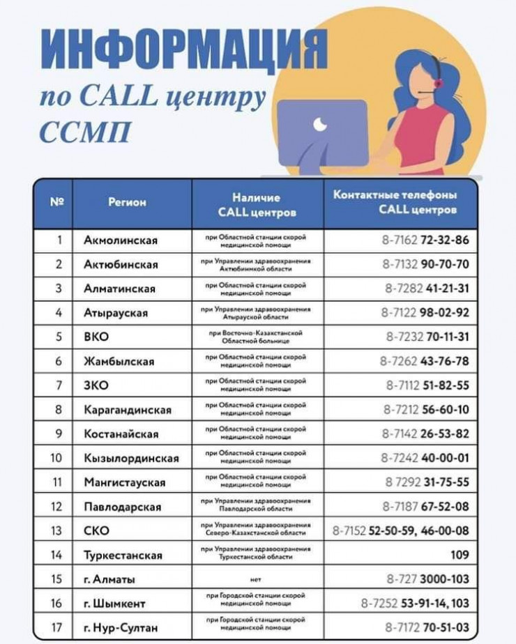 Ниже приведены актуальные номера сall-центров в Нур-Султане, Шымкенте, а также в административных центрах областей.
