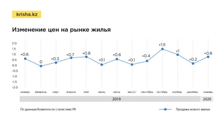 Рост цен на первичное жильe за год (январь 2020-го к январю 2019-го) произошeл в девяти регионах Казахстана. Наибольшее увеличение, согласно Комстату, зафиксировано в Костанае (+14 процентов), Нур-Султане (+11,9 процента) и Алматы (+7,4 процента), снижение - в Усть-Каменогорске (- 4,5 процента).