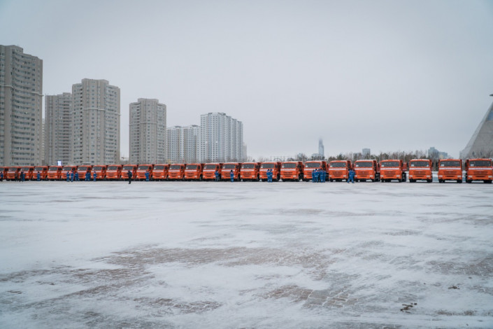 В столице парк коммунальных служб пополнился новой спецтехникой. Для уборки дорог и тротуаров от снега поступило свыше 60 единиц техники, среди которых самосвалы, лаповые погрузчики, автогрейдеры, комбинированные дорожные машины с распределителем сухих противогололедных материалов, тракторы и так далее.
