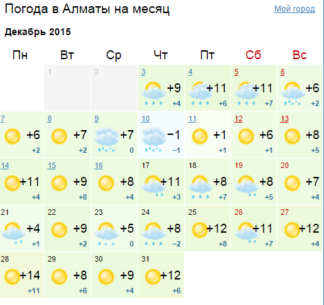 Уже в конце рабочей недели - 4 декабря 2015 года - синоптики прогнозируют осадки, усиление ветра с порывами до 25 метров в секунду. Погода в выходные прояснится с понижением температуры воздуха ночью до 10 градусов мороза. Дневная температура воздуха будет составлять 3-8 градусов тепла. "Затем частая смена барических образований приведет к смене волн холода и тепла. Очередное похолодание, по интенсивности схожее с предыдущим, следует ожидать в конце первой и начале второй декады, а наиболее интенсивное похолодание придет в начале третьей декады, когда температура воздуха понизится ночью до 15-20 градусов ниже нуля, днем до минус 5 -10 градусов", - сообщили в "Казгидромете".