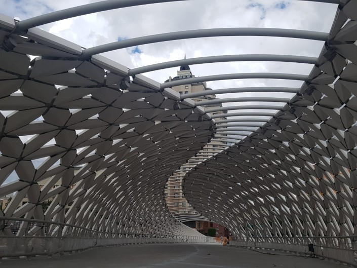 Мост должен обеспечить связь пешеходных потоков и велосипедной сети парковой зоны и набережной линии правого берега реки Есиль. Внешняя оболочка состоит из алюминиевых кассетных панелей треугольной формы, создающих защиту от атмосферных осадков и безопасность. В центральной части кольцевого схода подразумевается расположение общественного пространства, выполненного в виде шатра-навеса из ромбовидных фигур. Дизайн "Атырау көпірі" - отсылка к мировым трендам архитектуры, выглядит современно и свежо и создает внутри пешеходной зоны причудливую игру света и тени.