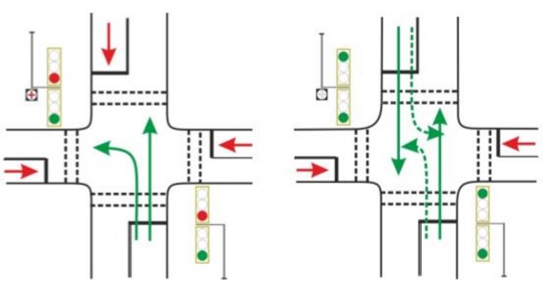 "На перекрестке проспекта Кабанбай батыра и Кургальжинского шоссе по второстепенному направлению (Кургальжинское шоссе) разрешающий сигнал светофора для транспорта, двигающегося от проспекта Туран, включается раньше, чем встречному. И в этот период имеется возможность "бесконфликтно/безопасно" совершить поворот налево (рисунок 1). При этом по состоянию сигнала "+" водители смогут ориентироваться, горит ли в данный момент "красный" сигнал светофора для встречных водителей. Если сигнал "+" погас, то встречный поток начинает движение и необходимо его пропустить (рисунок 2). Тем самым повышается безопасность дорожного движения", - рассказали в МПС.